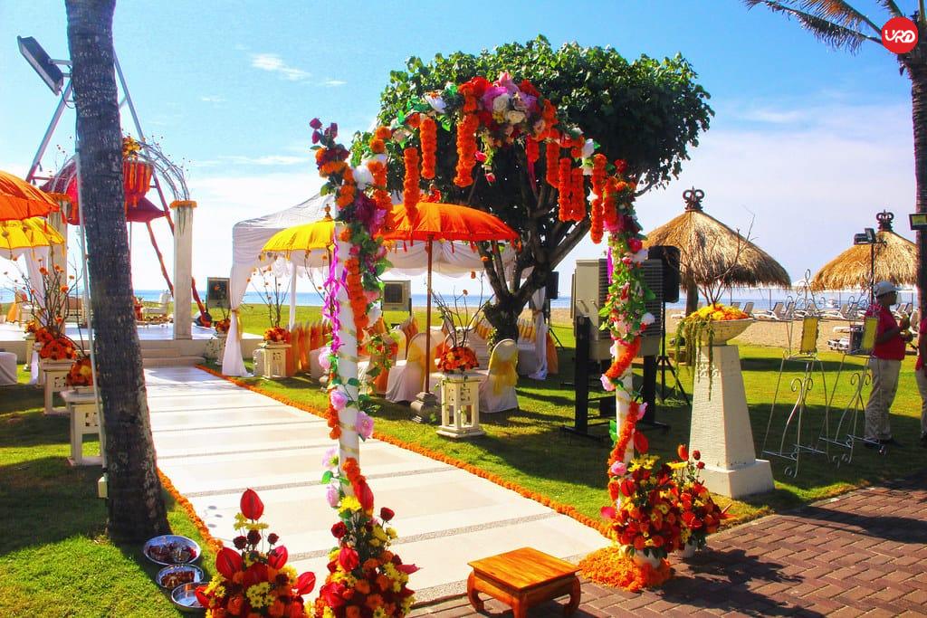 - Traditional mandaps adorned with tropical florals